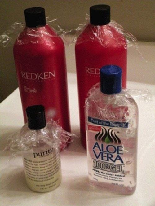 Hãy dùng túi ni lông bọc kín miệng tất cả các chai dầu gội, sữa tắm….trước khi vặn chặt nắp của chúng. Đừng để các loại dung dịch này tràn ra vali làm hỏng áo quần của bạn.