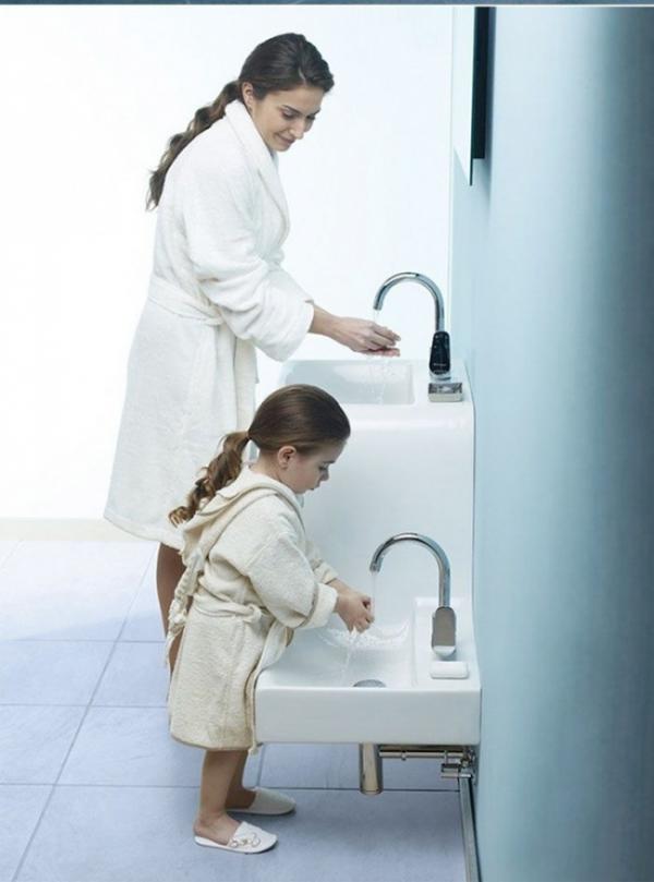 Từ đây bạn có thể tập cho con nhỏ thói quen vệ sinh sạch sẽ nhờ hệ thống bồn rửa thông minh này. Hệ thống gồm 2 tầng cao-thấp dành riêng cho người lớn và trẻ nhỏ.