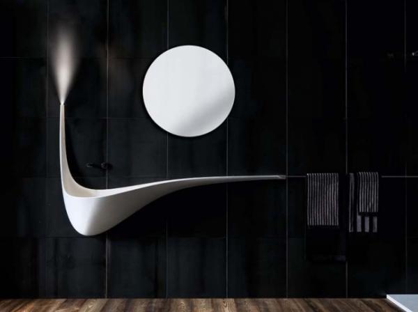 Bồn rửa được thiết kế với những đường cong mềm mại như cánh chim đang chao liệng giữa bầu trời bao la. Ngoài ra nó còn được trang bị một đèn trang trí ở phía trên và giá treo khăn theo chiều ngang.