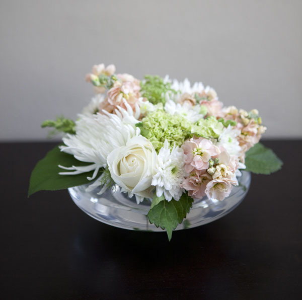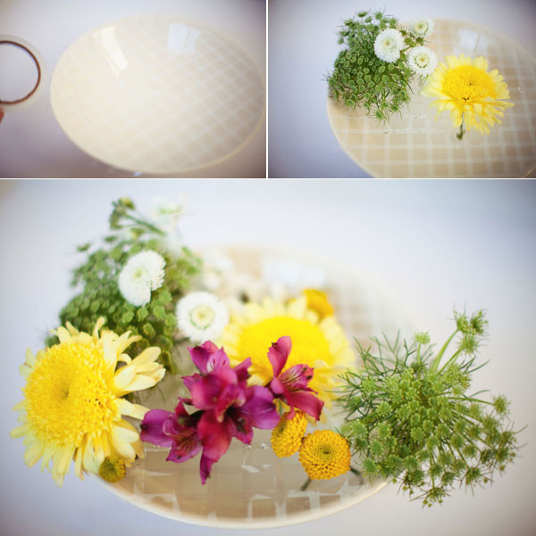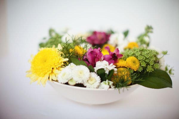 Chỉ với một chiếc bát thấp cùng với những loại hoa có sẵn trong vườn, bạn dễ dàng tự cắm thành bình hoa sắc màu rực rỡ tô điểm cho bàn ăn thêm yêu.