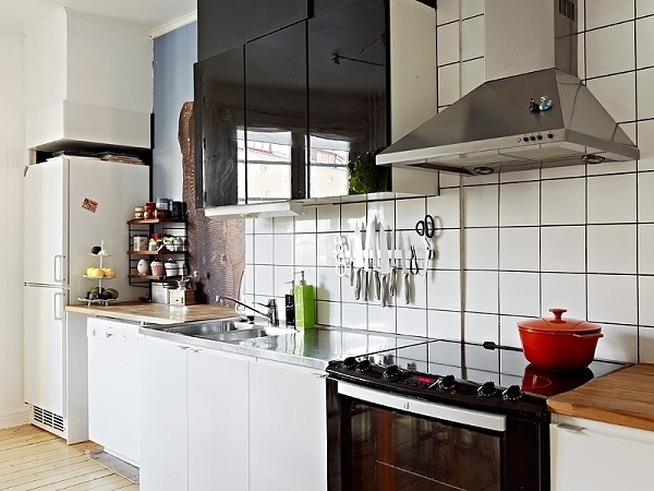 Màu đen của lò nướng, bếp nấu và máy hút mùi giúp căn bếp nhỏ thêm bắt mắt.