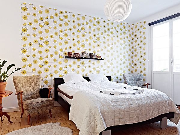 Để không gian nghỉ ngơi thêm mềm mại và cá tính, gia chủ đã chọn lựa giấy dán tường với họa tiết hoa cỏ màu vàng chanh nổi bật để làm đẹp cho bức tường đầu giường ngủ. Thêm những điểm nhấn từ kệ gắn tường và màu của giường để nơi nghỉ ngơi trở nên đẹp ấn tượng hơn.