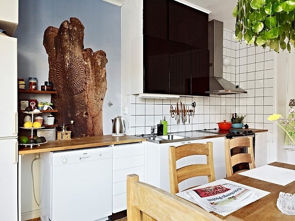 Góc bếp xinh xắn với gạch ốp tường và tủ đựng đồ màu trắng giúp vật dụng và tranh treo tường thêm nổi bật.