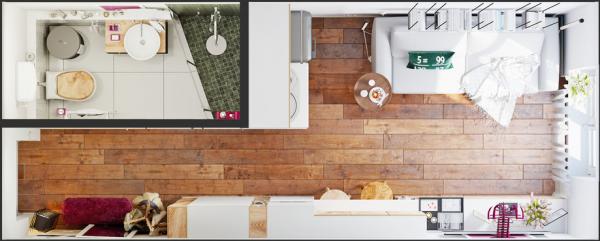 Căn hộ này chỉ gồm 2 không gian chính là phòng khách - ngủ, phòng tắm và một hệ kệ đa năng chạy dài theo tường để đáo ứng nhu cầu lưu trữ, trang trí. Đồng thời các món nội thất đa năng cũng được ưu tiên sử dụng để tăng cường chức năng mà vẫn vẫn đảm bảo sự gọn gàng.